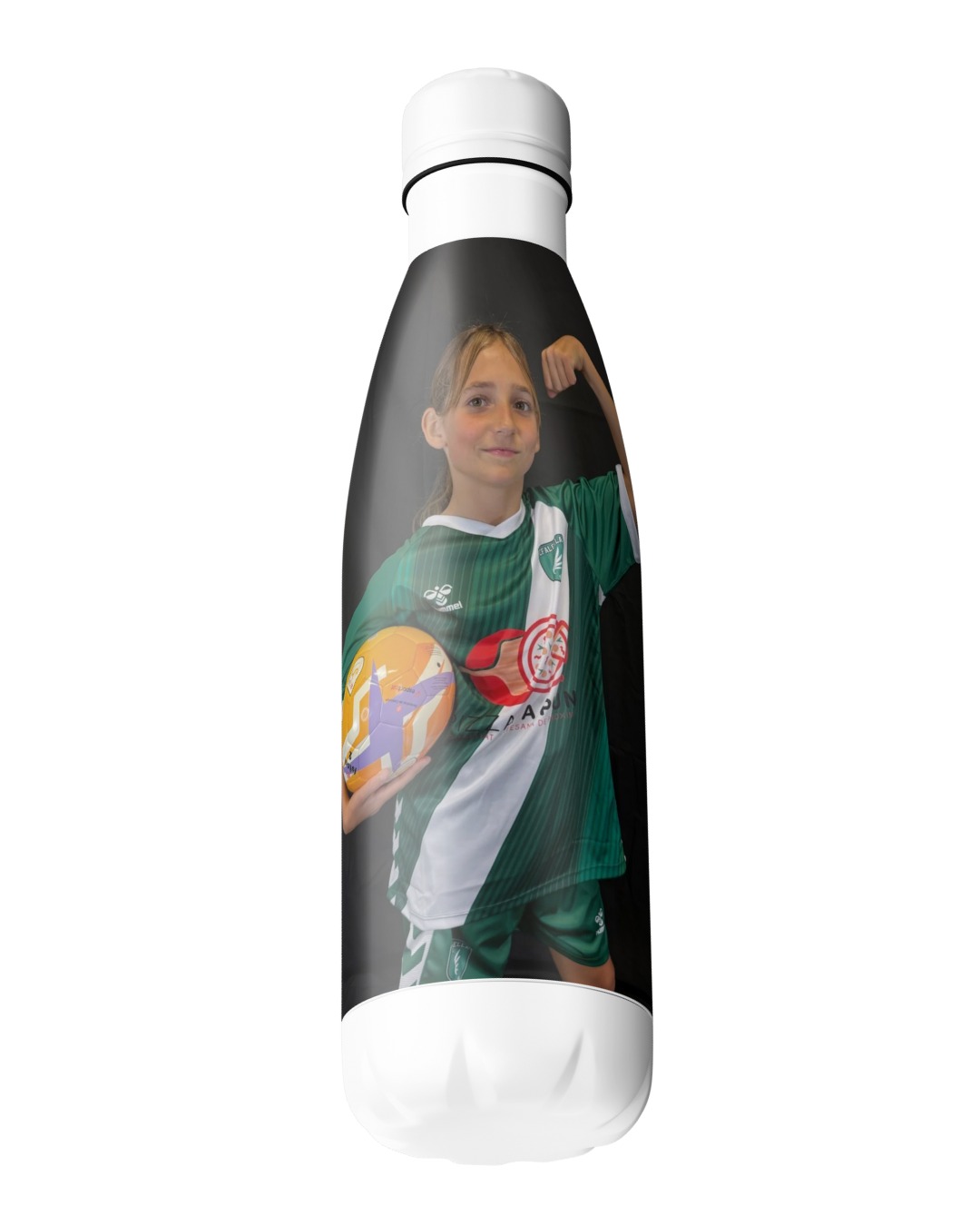 Ampolla metàl·lica amb impressió del logo del CF Alella i la foto del nen, pràctica i resistent.