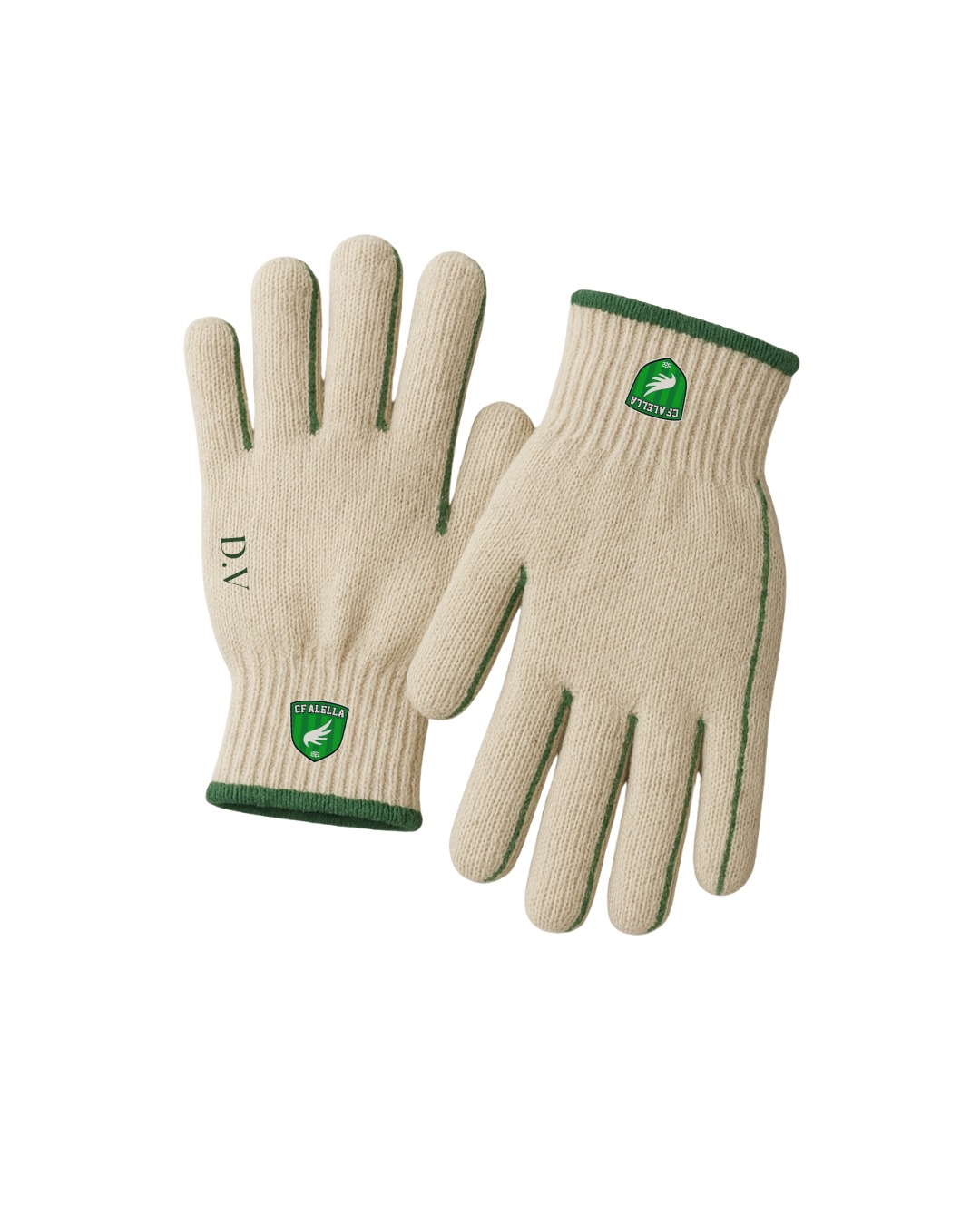 Guants tèxtils de color clar amb el distintiu del CF Alella, perfectes per entrenar o animar l’equip en dies freds.