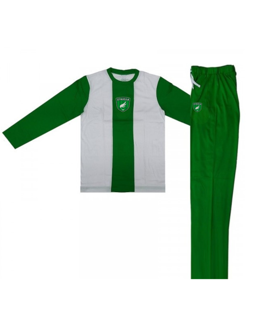 Pijama de màniga llarga amb els colors verd i blanc del CF Alella, còmode per a l’hivern.